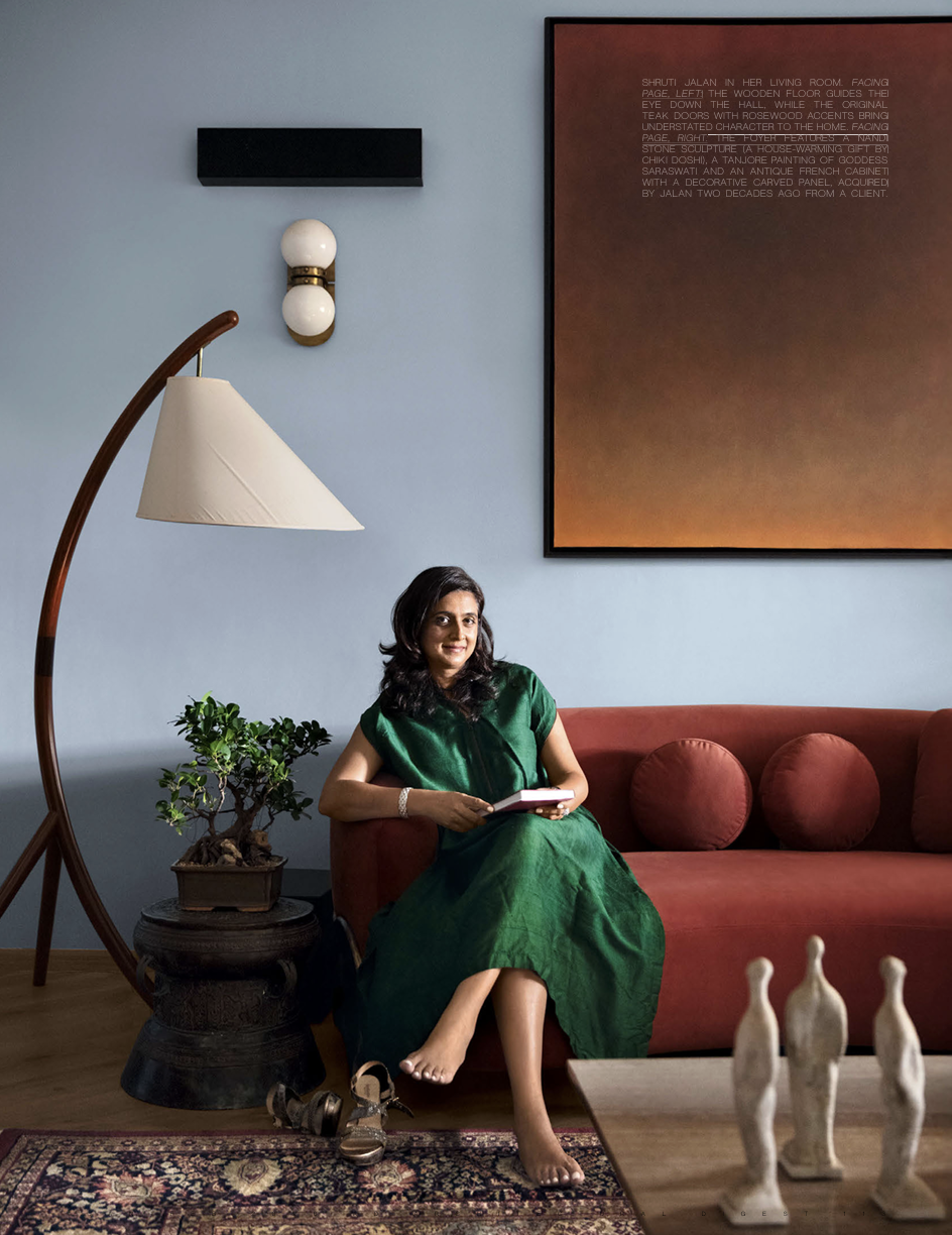 Perched on a quiet boulevard that winds gently up a hill in South Mumbai stands a graceful art deco building constructed in the late 1930s. Within one of its sprawling apartments lives architect Shruti Jalan with her husband and son. They moved in a year ago. Jalan was immediately taken by its generous size, floor-to-ceiling windows and the quietude it offered, despite being in the midst of bustling Breach Candy. “It was built on a hill, which was once the site of an old lighthouse,” she says. Its elevation naturally muffles the city’s noise, while the residence’s original 18-inch walls add to the hush. “It’s like a cocoon,” she continues. “At any point of the day, you’ll only hear birds”—barbets and golden orioles abound.